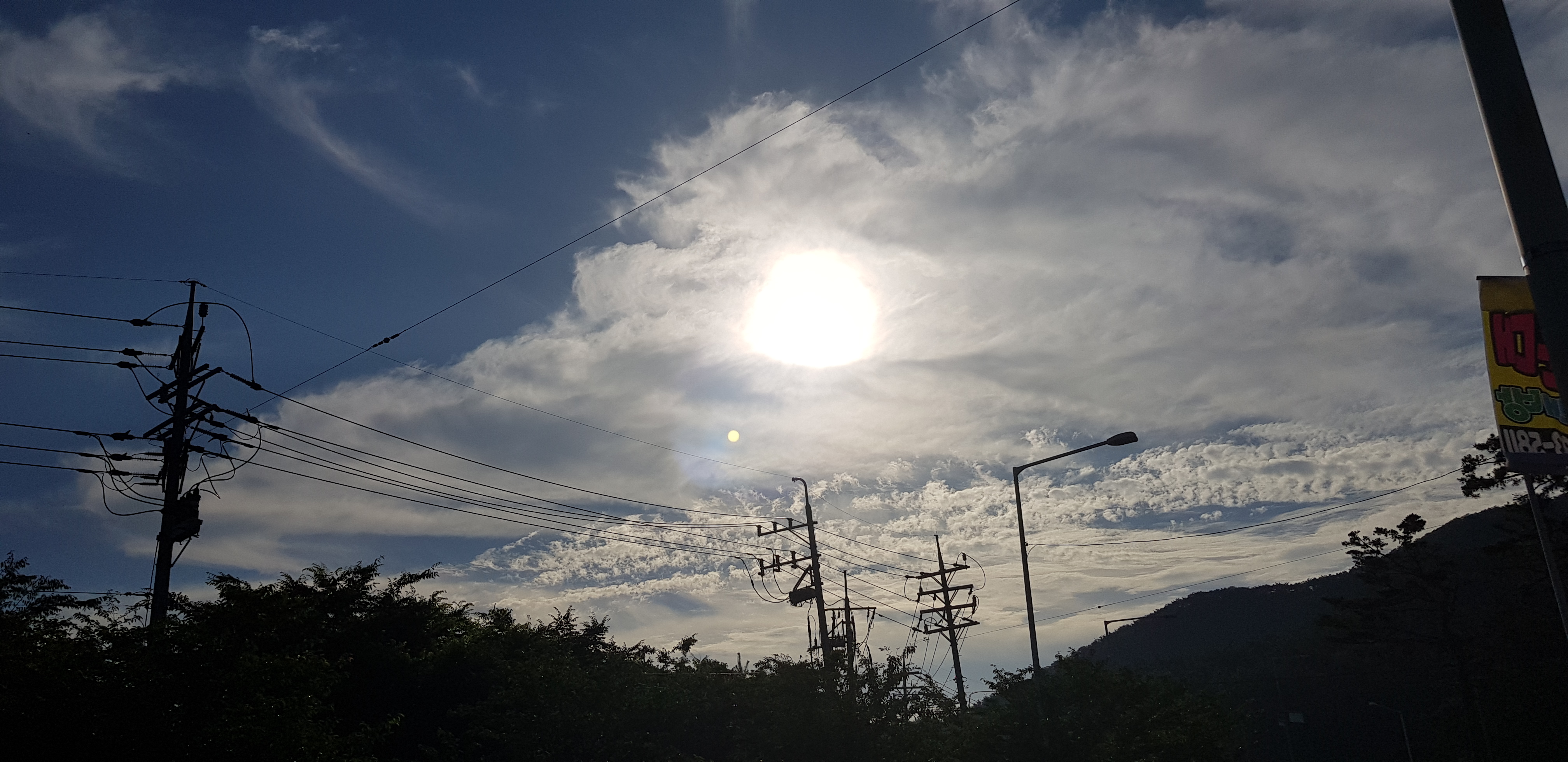 우와! 이렇게 아름답게 펼쳐진 하늘이! 포스트카드에 그려져 있을 것 같은 느낌이다. 선명하고 예쁜 하늘에 구름이 한겹쳐져 있어서 해가 보인다.